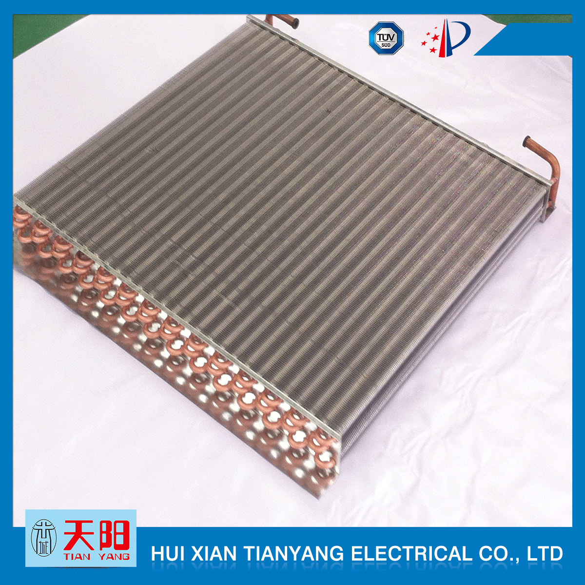 輝縣天陽電器有限責任公司位于肥沃的中原河南省輝縣市學院路中段工業集聚區興業園3號廠房,以制冷設備用冷凝器,蒸發器,熱交換器為主。主要材料為銅管鋁翅片,銅管銅翅片,鋁管鋁翅片。廣泛應用于冰箱冰柜,制冷設備,暖通設備,空調,自動售貨機,冷干機,超市立風柜,冷藏車,烘干機等產品領域。  公司自1998年成立以來,始終堅持:“科技造就產業、質量成就信譽、誠信鑄就輝煌”的質量方針,從產品拓展上堅持“人無我有,人有我優,人優我特的”經營理念,25年來,從1998年開始供應河南冰熊集團下屬的冷柜廠,制冰機廠各種冷凝器;2003年之后,原冰熊集團的精英志士開始在全國各地發展,所到之處依托我公司供貨,以致于多家目前已具行業中佼佼者的公司,從而建立了如凱雪公司,兆邦公司、凌云公司、海寶公司、正雪公司、上海忠云、山東德萊維等幾十余家公司在草創時期的啟蒙供貨商,友好共贏長達十余年,成為我國制冷行業的供應商。以致在2015年初雙匯集團面向社會的招標書中指名要我公司冷凝器、蒸發器指定產品供應商